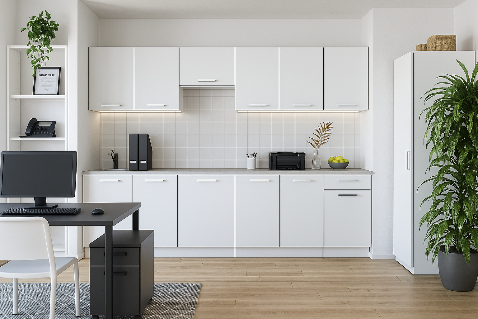 Kushina për ambiente zyre, është projektuar për të ofruar funksionalitet të plotë në një hapësirë të përmbledhur dhe elegante, duke u përshtatur në mënyrë të përkryer me mjediset profesionale. Struktura është ndërtuar nga panel melamine me trashësi 16 mm, e cila garanton qëndrueshmëri të mirë, peshë të lehtë dhe një pamje të pastër. Rifinitura është rezistente ndaj gërvishtjeve dhe lagështisë, si dhe shumë e lehtë për t’u mirëmbajtur, një avantazh i rëndësishëm për përdorim të përditshëm në zyrë. Bangoja është element thelbësor i dizajnit, me trashësi 4 cm. Ajo përbëhet nga material postforming me qëndrueshmëri të lartë ndaj lagështisë, gërvishtjeve dhe nxehtësisë.