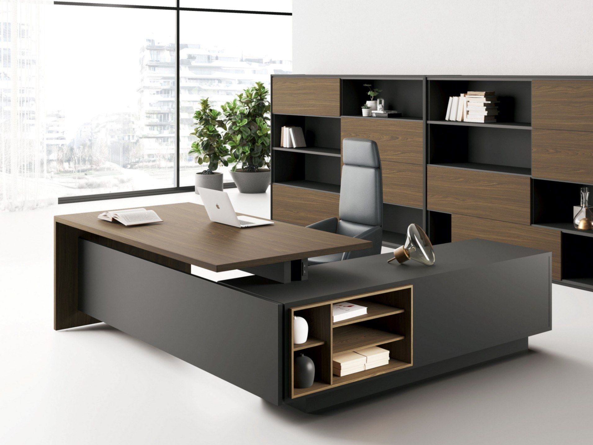 Tavolina Riomax është një zgjedhje ideale për profesionistët që kërkojnë një ambient pune me stil modern dhe funksionalitet të lartë. Tavolina është e formës L dhe përfshin një njësi anësore të integruar me hapësira të hapura dhe të mbyllura për organizim materialesh të shtypura që përdoren shpesh. Pjesa horizontale kryesore e tavolinës ofron sipërfaqe të bollshme për: PC, laptop, dokumente dhe pajisje pune. Njësia anësore, me ndarje të dukshme për dosje, libra dhe aksesorë dekorativë, i shton karakter funksional dhe estetik. Kjo e bën tavolinën jo vetëm praktike, por edhe një pikë qendrore të ambientit.