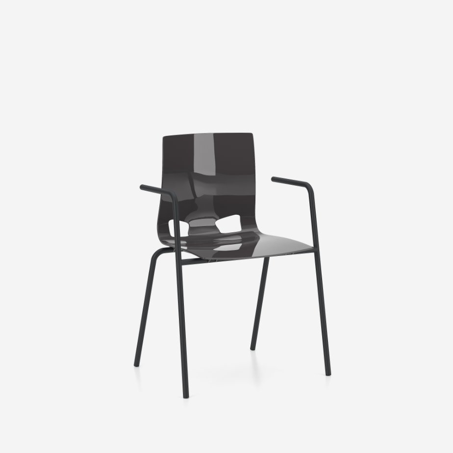 Karrigia Fondo është një karrige konference e ndërtuar mbi një kornizë të qëndrueshme me katër këmbë prej çeliku të veshur me pluhur, e cila siguron stabilitet dhe jetëgjatësi. Krahët janë të integruar drejtpërdrejt me kornizën, duke i dhënë strukturës një formë të fortë dhe të pandarë, ndërsa mbështetësja e shpinës është e hapur për të ofruar një dizajn funksional dhe ergonomik. Elementët metalikë janë realizuar nga çelik i veshur me pluhur, ndërsa elementët plastikë kanë një përfundim me shkëlqim, që i shton produktit cilësi vizuale dhe praktike. Për dysheme të buta, karrigia është e pajisur me glidet e posaçme të tipit GB, të cilat garantojnë lëvizje të qëndrueshme dhe mbrojtje të sipërfaqes. Dimensionet e saj janë të balancuara për rehati dhe funksionalitet: lartësia totale shkon deri në 830 mm, ndërsa ndenjësja ka një lartësi prej 465 mm. Gjerësia totale e karriges është 590 mm, me gjerësi ndenjëseje 445 mm dhe gjerësi të mbështetëses së shpinës 410 mm. Thellësia totale është 490 mm, ku thellësia e ndenjëses është 390 mm dhe sipërfaqja e ndenjëses arrin në 370 mm. Mbështetësja e shpinës ka gjatësi 360 mm, ndërsa lartësia e krahëve arrin deri në 675 mm, duke ofruar përmasat e nevojshme për një përdorim të rehatshëm dhe të balancuar në çdo ambient konference apo pune.