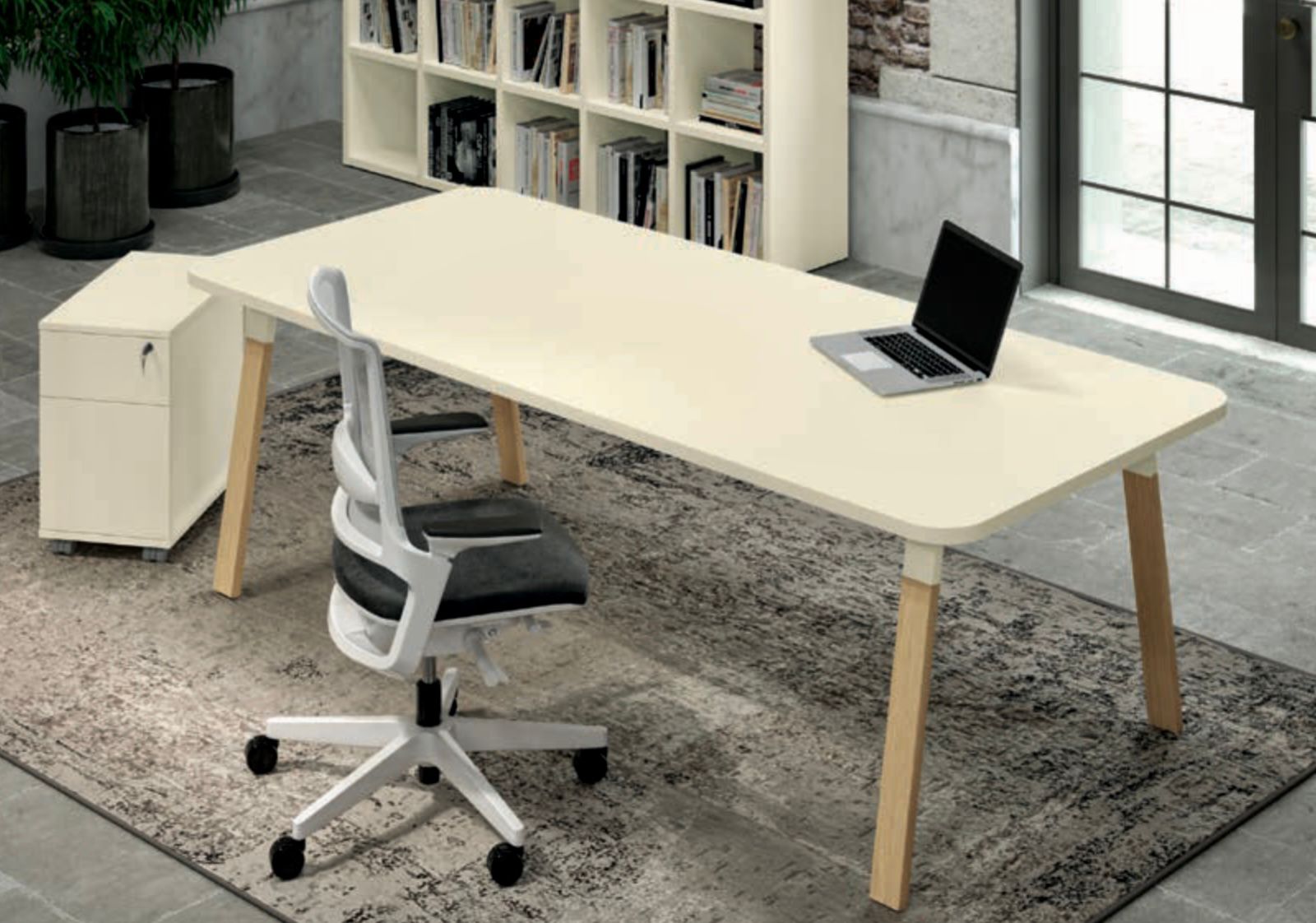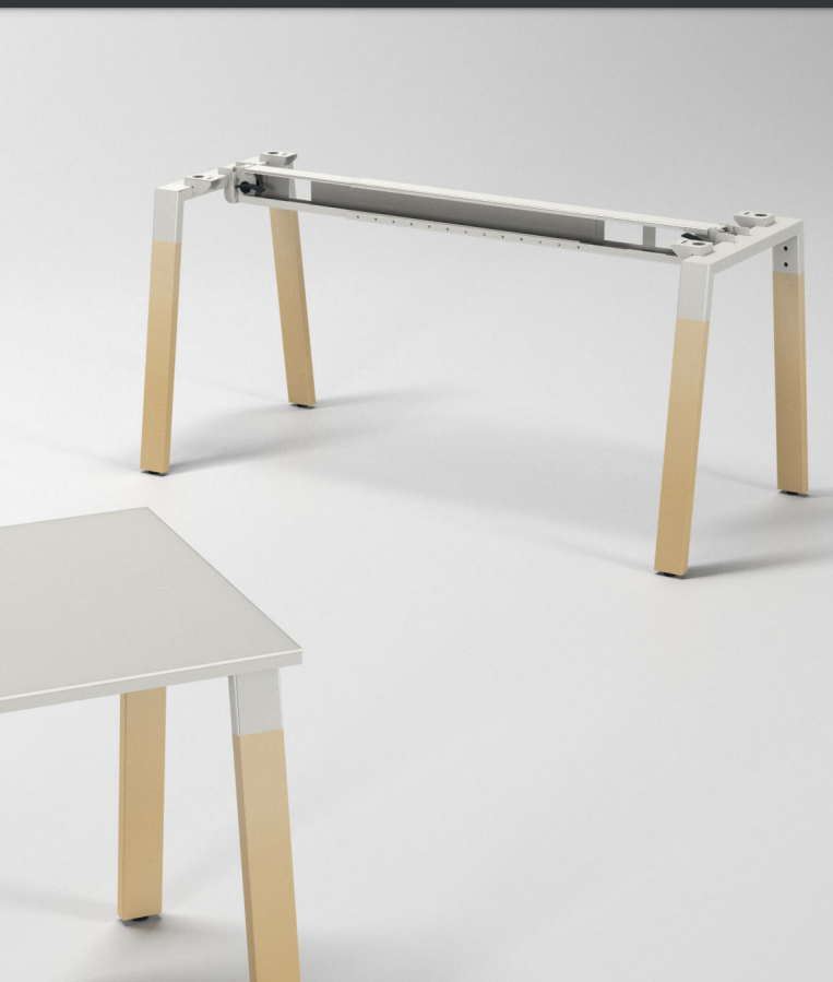 Syprina e tavolinës është prej melamine me trashësi 25 mm, e shirituar me P.V.C. mbrojtëse 2 mm, e cila garanton rezistencë ndaj konsumit, lagështisë dhe goditjeve. Ngjyra dhe madhësia e syprines realizohet sipas preferencave të klientit, duke mundësuar përshtatjen me identitetin vizual të çdo ambienti zyre. Këmbët janë metal dhe dru i kombinuar të cilat lidhen me traversë tubolare e fiksuar në mënyrë të palëvizshme. Montimi dhe çmontimi i tavolinës realizohet lehtë falë çernierave të çmontueshme, që e bëjnë atë të lehtë për t’u zhvendosur.